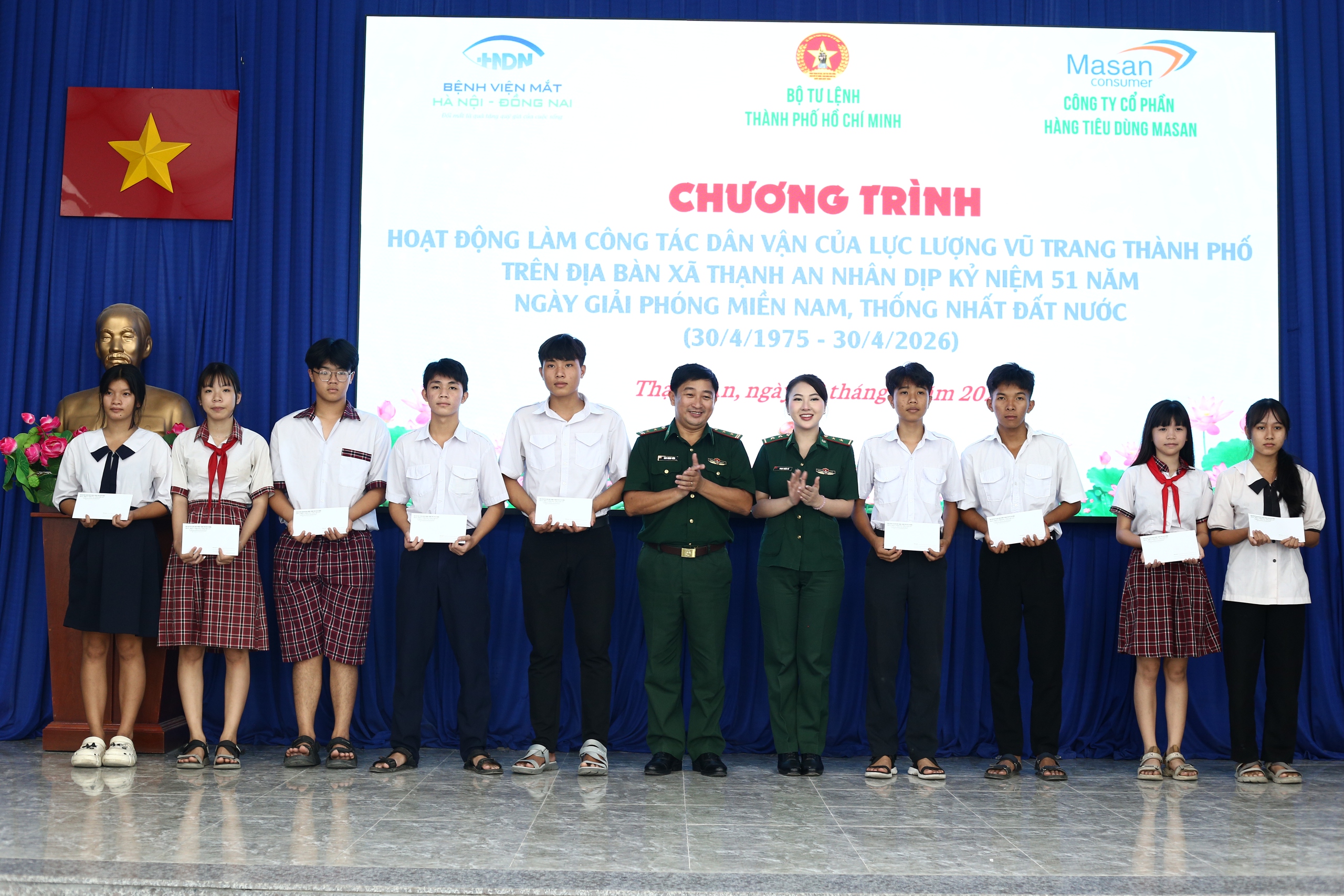 Sáng 23-4, Bộ Tư lệnh TP.HCM phối hợp Bệnh viện Mắt Hà Nội - Đồng Nai, Công ty cổ phần Hàng tiêu dùng Masan và xã Thạnh An tổ chức hoạt động công tác dân vận trên địa bàn xã nhân kỷ niệm 51 năm ngày thống nhất đất nước.
