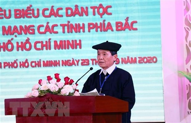 Già làng Vàng Xíu Dư, người dân tộc Mông tỉnh Hà Giang đại diện Đoàn đại biểu Già làng, Trưởng bản, Già làng phát biểu tại buổi giao lưu tại Thành phố Hồ Chí Minh. (Ảnh: Xuân Khu/TTXVN)