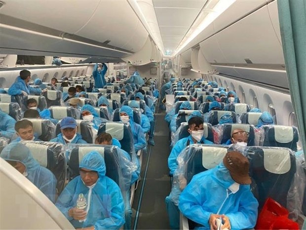 Các công dân trên chuyến bay của Hãng Hàng không Việt Nam (Vietnma Airlines) mang số hiệu VN6. (Ảnh: TTXVN/phát)