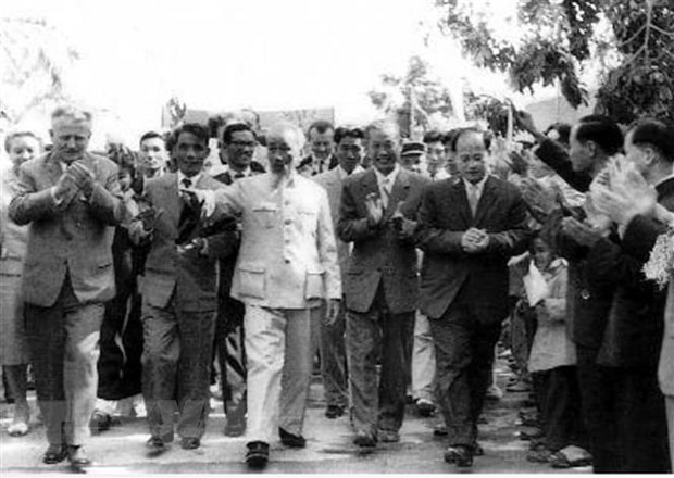 Chủ tịch Hồ Chí Minh cùng lãnh đạo Đảng và Nhà nước Cộng hòa xã hội chủ nghĩa Tiệp Khắc thăm Bệnh viện Hữu nghị Việt Tiệp Hải Phòng năm 1963. (Ảnh: TTXVN phát)
