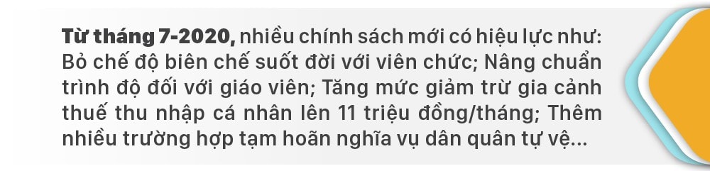 Từ tháng 7/2020, nhiều chính sách mới có hiệu lực như: Bỏ chế độ biên chế suốt đời với viên chức; Nâng chuẩn trình độ đối với giáo viên; Tăng mức giảm trừ gia cảnh thuế thu nhập cá nhân lên 11 triệu đồng/tháng; Thêm nhiều trường hợp tạm hoãn nghĩa vụ dân quân tự vệ...