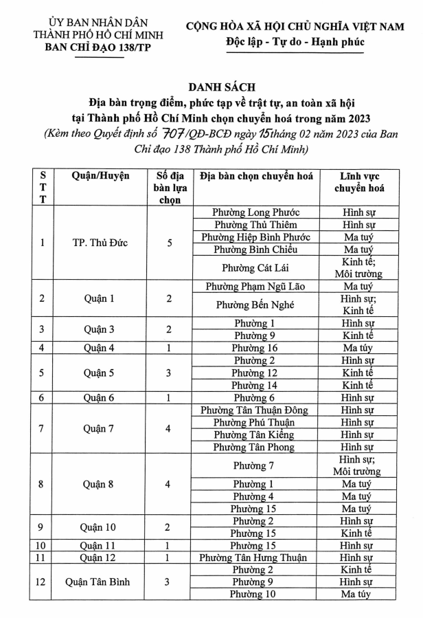 Theo đó, Quyết định 707/QĐ-BCĐ của Ban chỉ đạo 138 phê duyệt danh sách 47 địa bàn trọng điểm, phức tạp về trật tự, an toàn xã hội tại TPHCM được chọn chuyển hoá trong năm 2023.