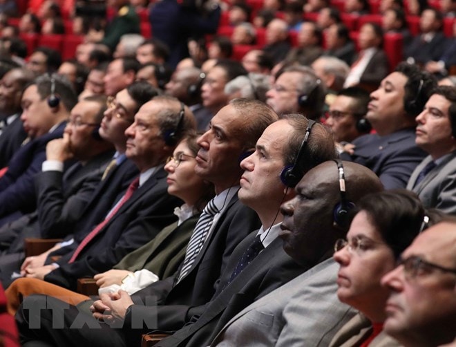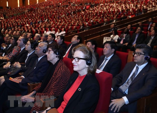 Các đại biểu quốc tế dự Lễ kỷ niệm 90 năm Ngày thành lập Đảng Cộng sản Việt Nam. (Ảnh: Thống Nhất/TTXVN)