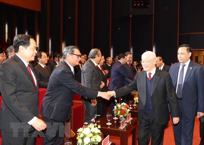 Tổng Bí thư, Chủ tịch nước Nguyễn Phú Trọng với các đồng chí lãnh đạo, nguyên lãnh đạo Đảng, Nhà nước và các đại biểu dự Lễ kỷ niệm. (Ảnh: Trí Dũng/TTXVN)