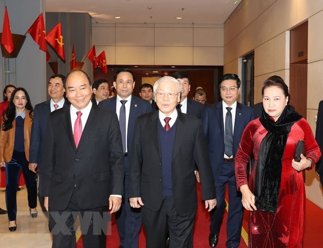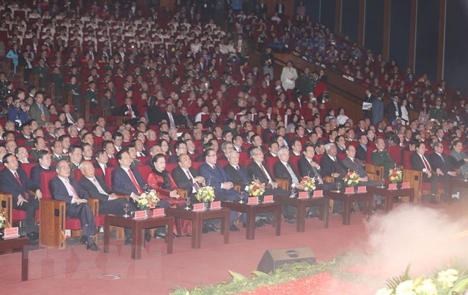 Tổng Bí thư, Chủ tịch nước Nguyễn Phú Trọng, Thủ tướng Nguyễn Xuân Phúc, Chủ tịch Quốc hội Nguyễn Thị Kim Ngân dự Lễ kỷ niệm. (Ảnh: Trí Dũng/TTXVN)