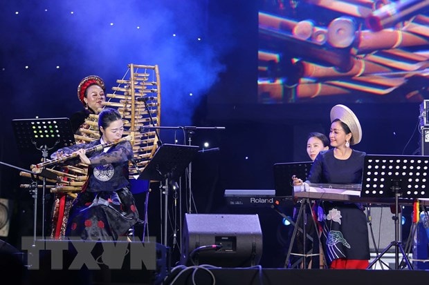Tiết mục biểu diễn của nhóm Asia Music Ensemble Project kết hợp làn điệu nhạc truyền thống hò, lývới các tiết tấu hiện đại. (Ảnh: Thanh Vũ/TTXVN)