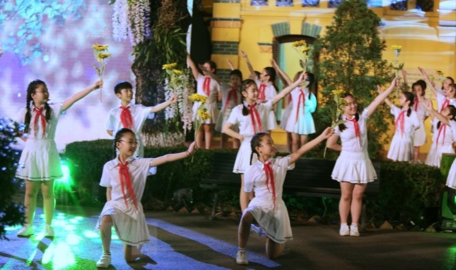Tiết mục văn nghệ trong chương trình cầu truyền hình 'Hồ Chí Minh - Sáng ngời ý chí Việt Nam' tại điểm cầu Bến Nhà Rồng, Thành phố Hồ Chí Minh. (Ảnh: Thanh Vũ/TTXVN)