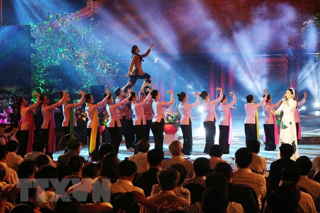 • Một tiết mục nghệ thuật tại điểm cầu Hà Nội.. (Ảnh Doãn Tấn/TTXVN)