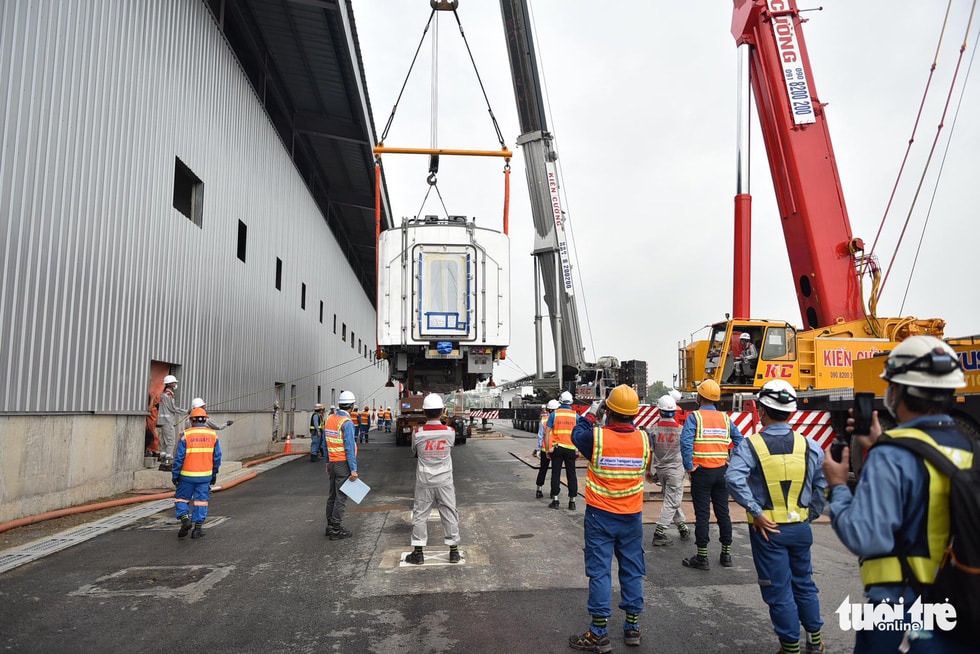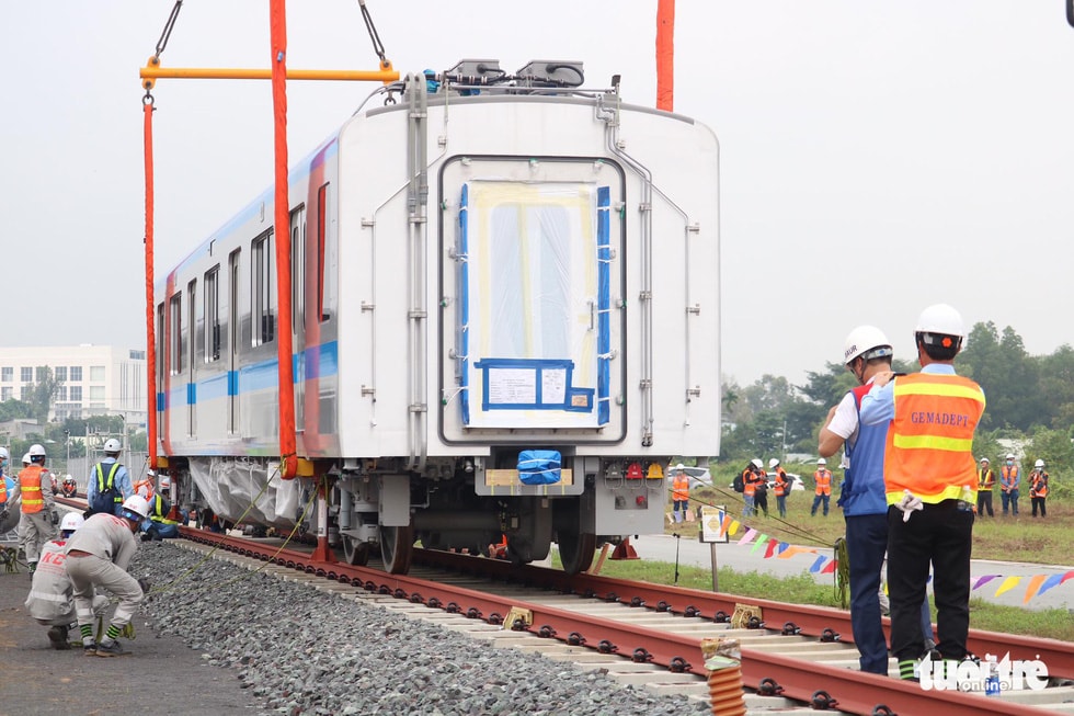 Tại công trường depot Long Bình, ông Nguyễn Bùi Minh Quân - phó giám đốc Ban quản lý dự án 1 (Ban quản lý đường sắt đô thị TP.HCM) cho biết hôm nay các nhà thầu sẽ cẩu lắp 3 toa tàu lên đường ray số T1 depot Long Bình. Sau đó, các chuyên gia sẽ kiểm tra hệ thống và lắp ráp 3 toa tàu lại thành một đoàn tàu. Thời gian tới, các nhà thầu sẽ thi công lắp điện để chuẩn bị chạy thử nghiệm.