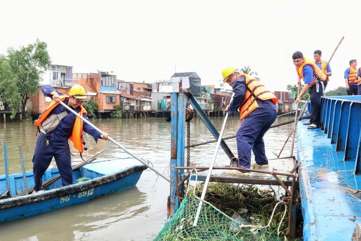 Dù trời đổ mưa từ sáng sớm nhưng đoàn viên của các đơn vị vẫn đến đông đủ, chờ đón các hộ dân khó khăn đến nhận các suất quà và triển khai các hoạt động ý nghĩa khác. Một tốp đoàn viên tiến hành vớt, thu gom rác trên tuyến kênh Đôi (đoạn từ cầu Hiệp Ân đến cầu Nguyễn Văn Cừ, quận 8) bằng ghe, sà lan.