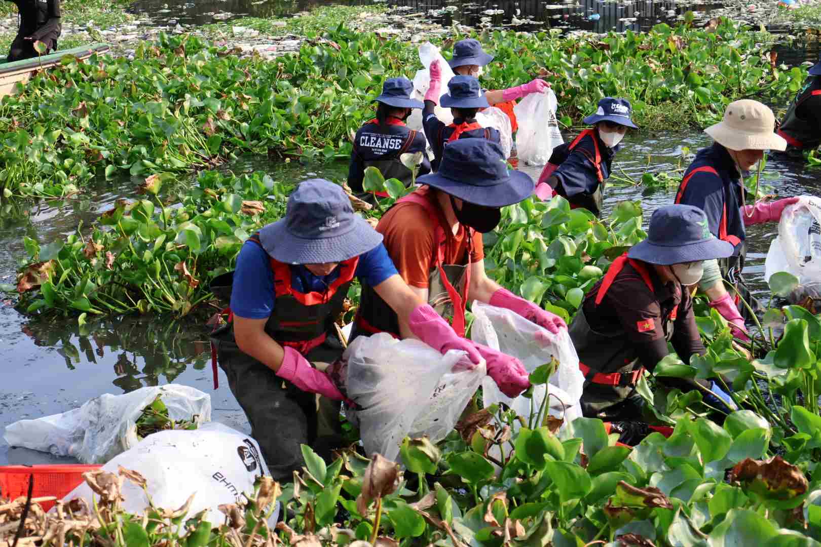 Rất đông tình nguyện viên, đoàn viên thanh niên phường Tân Hưng chung sức dọn sạch ao Song Tân. Ảnh: Minh Tâm.