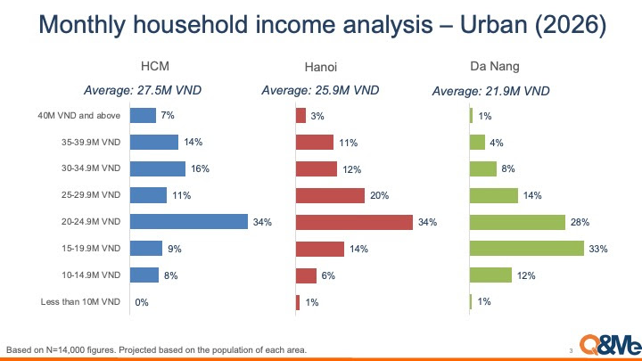 Báo Pháp luật TP cho biết, Công ty nghiên cứu thị trường Q&Me vừa chia sẻ báo cáo cập nhật mới nhất về xu hướng thu nhập hộ gia đình tại Việt Nam năm 2026, dựa trên dữ liệu thu thập từ hơn 14.000 người tham gia trên toàn quốc trong một năm qua.