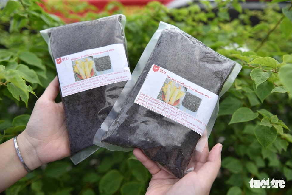 Ngoài tận dụng thân cây chuối tách bẹ làm túi (giá từ 6.000 - 21.000 đồng/chiếc tùy kích cỡ), phần bên trong cây chuối còn được nhóm tận dụng làm phân bón hữu cơ (giá 2.500 đồng/kg).