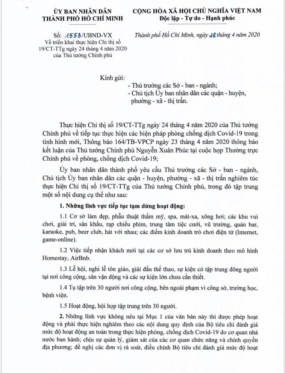 Các nội dung chỉ đạo trên được áp dụng từ ngày 29/4/2020 cho đến khi có chỉ đạo, hướng dẫn mới.