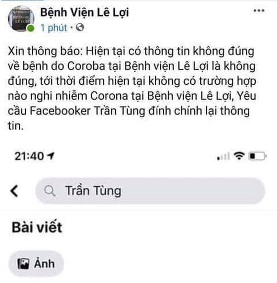 Như Báo SGGP đã thông tin, khuya ngày 27-1 (tức mùng 3 Tết Nguyên Đán), mạng xã hội lan truyền 1 nick name có tên là Trần Tùng đăng tải thông tin “hiện tại bệnh viện lê lợi, tp Vũng Tàu có 2 người Trung Quốc đang nghi vấn virus corona”.
