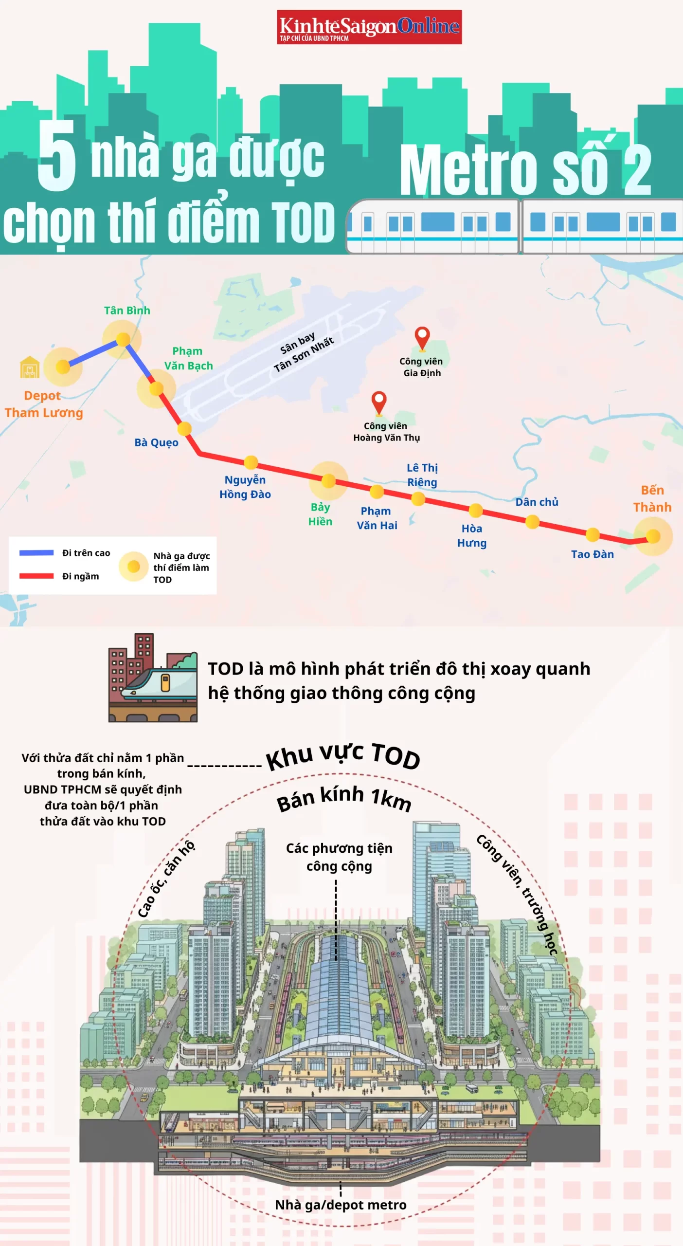 Theo kế hoạch do UBND TPHCM ban hành, mô hình phát triển đô thị theo định hướng giao thông công cộng (TOD) sẽ được triển khai thí điểm tại 5 điểm trên tuyến metro số 2, bao gồm depot Tham Lương cùng các nhà ga Phạm Văn Bạch, Tân Bình, Bảy Hiền và Bến Thành.