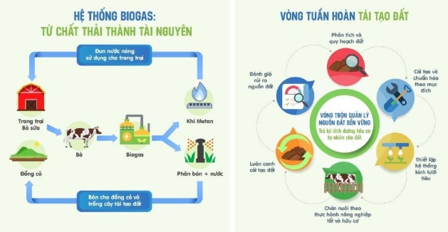 Vinamilk đã ứng dụng mô hình kinh tế tuần hoàn vào hệ thống trang trại và nhà máy từ nhiều năm qua. Bước đầu các sáng kiến này đã mang lại các hiệu quả tích cực. Đơn cử như tại các trang trại bò sữa, vòng tuần hoàn nông nghiệp xanh của Vinamilk với trọng tâm là công nghệ Biogas và nguyên lý biến chất thải thành tài nguyên. Đây là điểm sáng đáng ghi nhận trong nỗ lực triển khai kinh tế tuần hoàn tại Vinamilk, mang đến lợi ích đáng kể về môi trường, tận dụng năng lượng tái tạo và giảm thiểu đáng kể lượng CO2 phát thải.