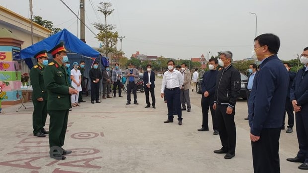 Lực lượng quân đội báo cáo tình hình tại điểm cách ly Trường mầm non Cẩm Phúc, Hải Dương. (Ảnh: PV/Vietnam+)